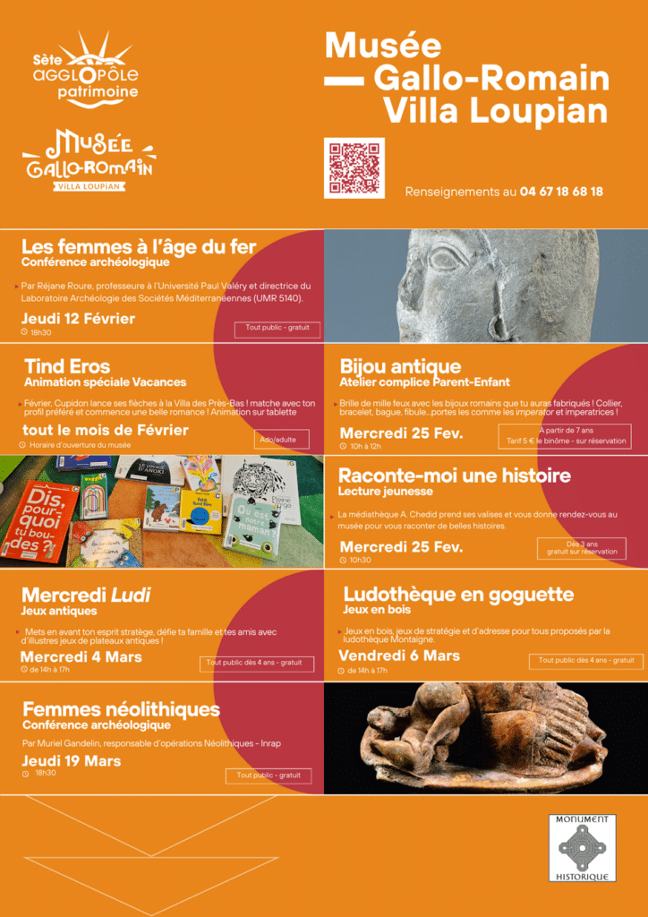 Les vacances d’hiver dans vos musées et jardins Pendant les vacances d’hiver, les équipements patrimoniaux de Sète agglopôle méditerranée proposent un programme d’animations pour petits et grands : ateliers créatifs, jeux, lectures et moments de découverte, en partenariat avec les médiathèques du territoire. Bijou antique Mercredi 25 février – de 10h à 12hMusée gallo-romain Villa-LoupianRéalisez un bijou d’inspiration antique à l’aide de perles, de fil de métal et de cuir.Atelier parent-enfant à partir de 6 ans – Tarif : 5 € le binômeSur réservation : 04 67 18 68 18 Raconte-moi une histoire Mercredi 25 février – 10h30Musée gallo-romain Villa-LoupianLa [...]
